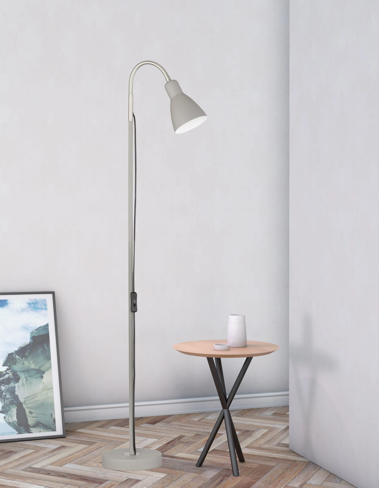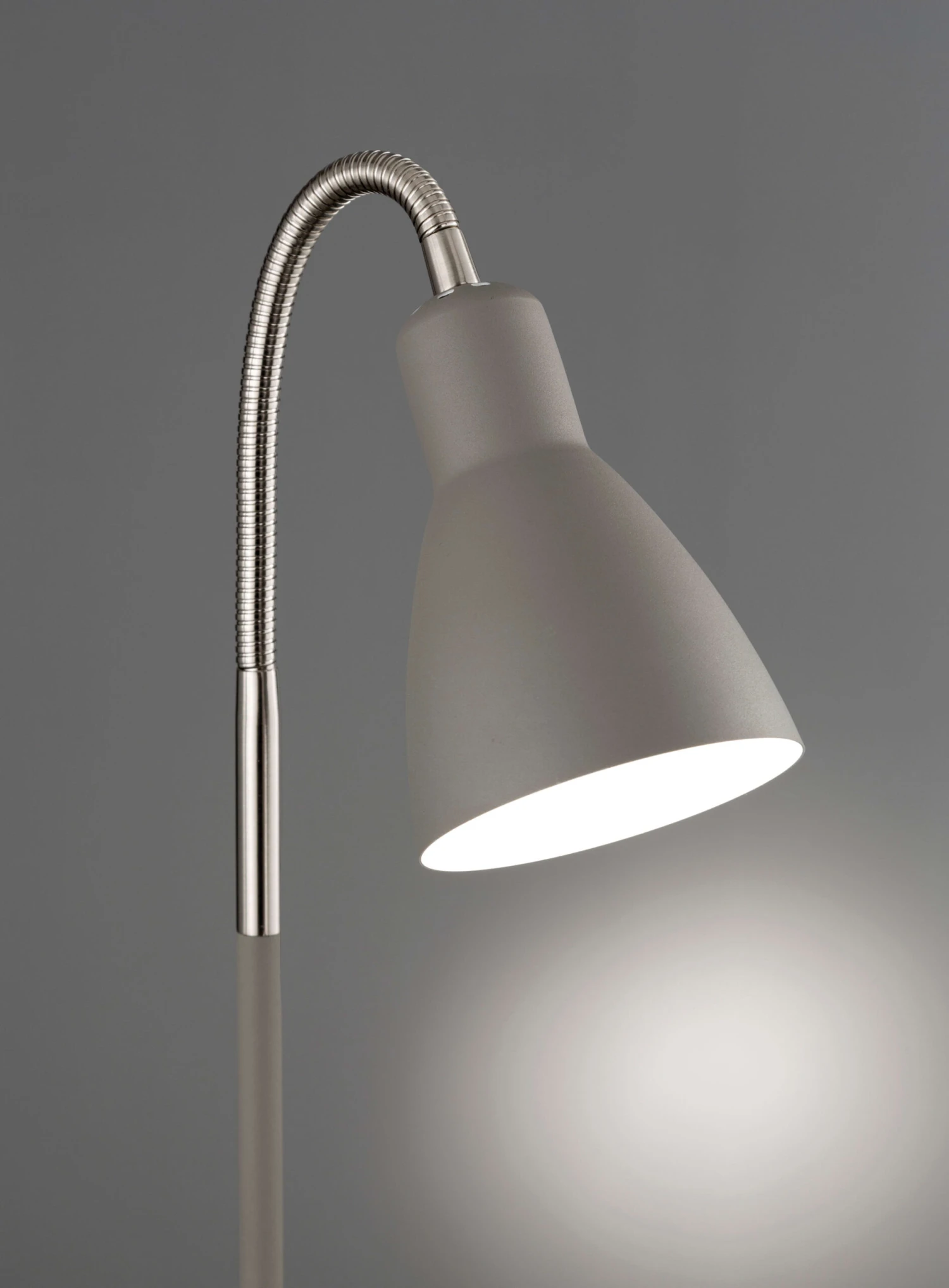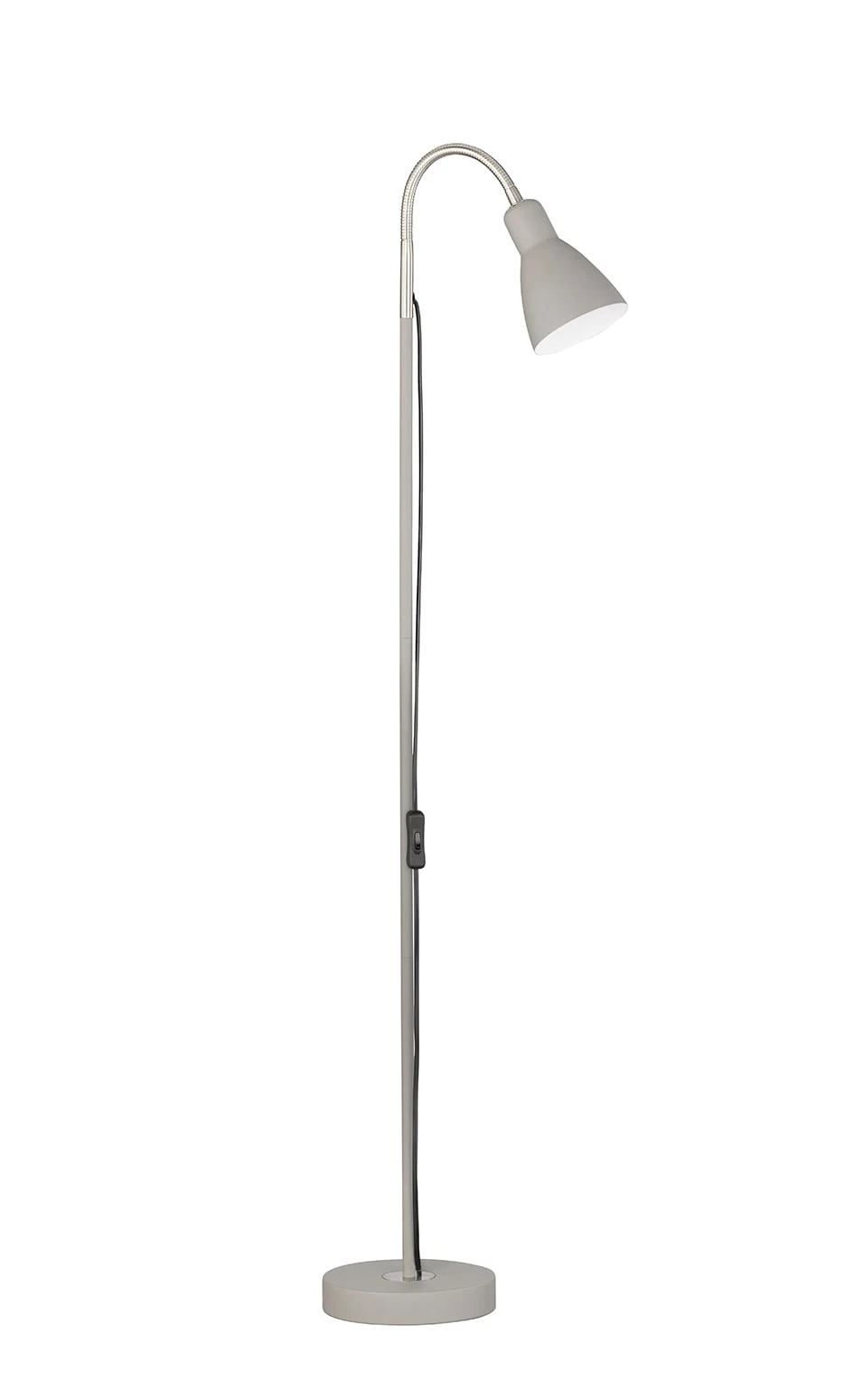 In sandgrau/nickelfarben passt sich diese Stehleuchte perfekt jedem Einrichtungsstil an. Besonders dem modernen „skandinavischen Wohnstil“ gibt dieser Artikel den zusätzlichen Charme. Mit einer Höhe von 121 cm und einer Ausladung von 30 cm ist dieses kleine Raumwunder aus dem Alltag nicht wegzudenken. Durch den integrierten Schnurschalter ist einfaches Ein- und Ausschalten gewährleistet.