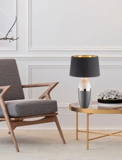 Alle mal hersehen – ein eleganter Auftritt mit zeitgenössischer Leichtigkeit. Überzeugen Sie sich selbst! Klein, aber oho! Leuchten auf Tischen, Kommoden oder Simsen kreieren Höhe in Fenstern und im Raum. Mit Stoffschirmen versehen, machen Sie gemütliches Licht. Immer nach dem Motto: lieber ein paar mehr! Feierabend – effektvolle Lichtinseln im Raum bringen Wärme. Diese Tischleuchte „Tone“ aus Keramik in schwarz/grau/kupferfarben mit dem dekorativen schwarzen Stoffschirm aus dem Hause Fischer & Honsel GmbH ist die beste Basis für ein gut beleuchtetes Heim. Mehrfach platziert verwandelt diese Tischleuchte Ihre Einrichtung in ein Wohnerlebnis.
